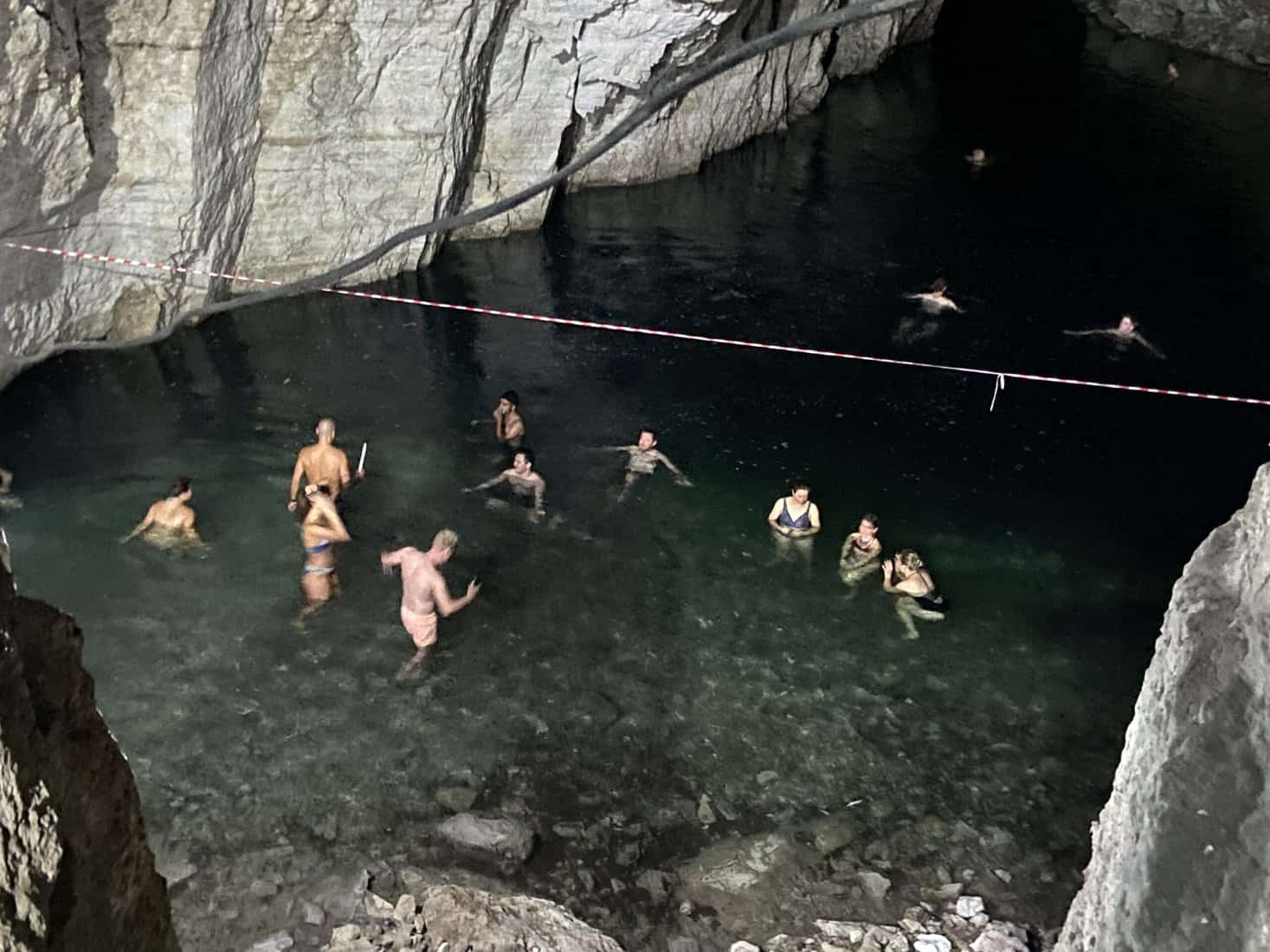 I descended precariously into the gaping maw of darkness. The faint light made it look like the entrance to a carnival ride. A ledge near the water allowed us to change into our swimsuits – out in the open as we all couldn’t fit in the four tiny, crude changing rooms.