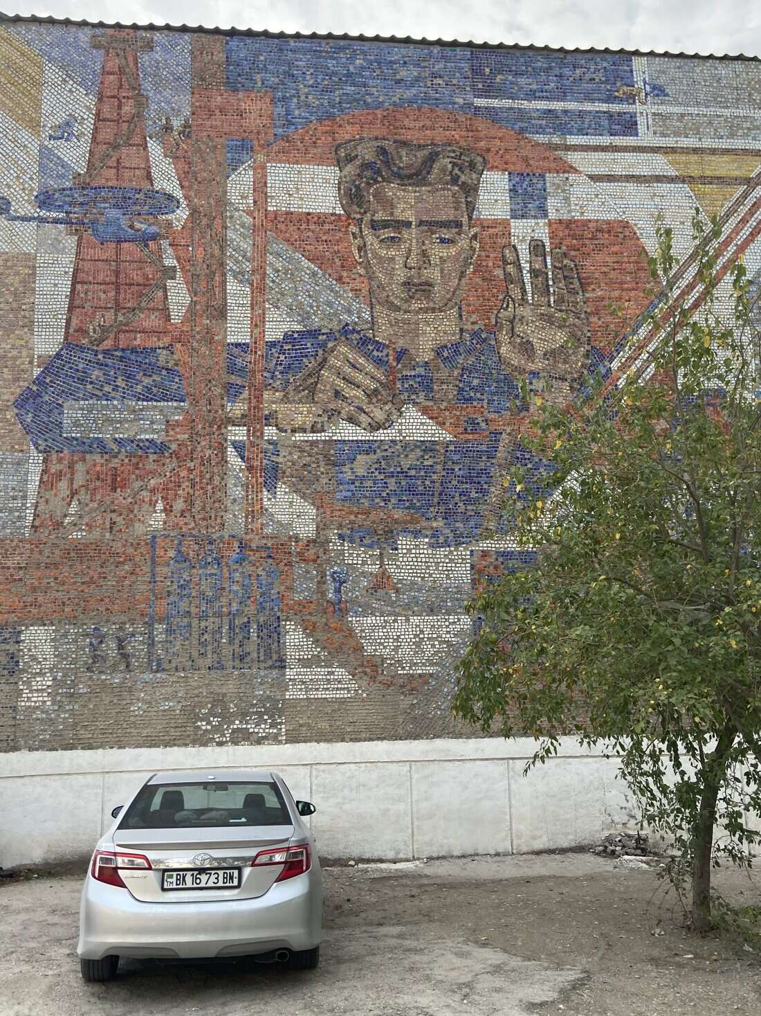 We crashed for the night in Balkanabat, a dreary city of about 140,000 lined with Soviet-style block apartment buildings (some featuring remarkable artwork on the walls) and anchored by a huge gold statue of Turkmenbashi, holding his ubiquitous autobiography and coat over his shoulder, like a Roman emperor.