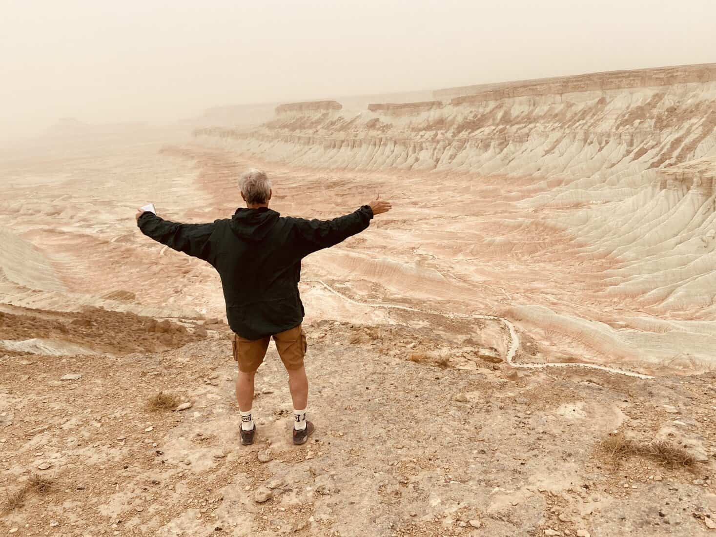 After another 90-minute drive, we came up to the top of a ridge. There, laying out for us like a beautiful Turkmen carpet, was Yangykala Canyon. It was a deep, deep canyon hundreds of meters down with pinkish cliffs that stretched to the horizon. Tall ridges lined the bottom like playing cards. An orange tint covered the floor.